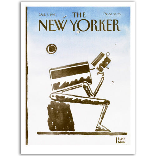 A robot, with a light bulb on top of its head, sits imitating Rodin's sculpture, 'Thinker.' R. O. Blechman has contributed 14 covers to The New Yorker, and remains an acclaimed illustrator, animator, and author. Elected to The New York Art Directors Hall of Fame, The Museum of Modern Art held a retrospective of his animated films in 2003. The National Cartoonists Society gave Blechman a Lifetime Achievement Award in 2011. Two years later his work was given a retrospective exhibition R.O. Blechman: The Inquiring Line: at The Norman Rockwell Museum.