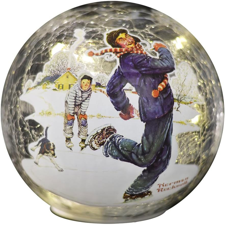 LED Lighted Christmas Globe features Norman Rockwell's Grandpa and Me: Ice Skating his classic portrait of a gradfatherly character enjoying ice skating, originally produced for the 1948 Brown & Bigelow Four Seasons calendar.