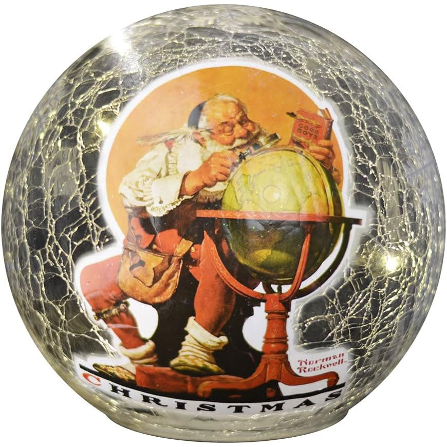 LED Lighted Christmas Globe features Norman Rockwell's Santa's Good Boys (Santa at Globe his classic portrait of jolly Santa Claus with magnifying glass and globe, originally published for the December 4th, 1926 cover of The Saturday Evening Post.