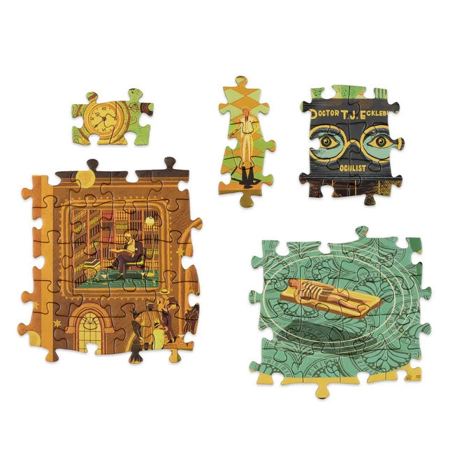 Piece together one of Jay Gatsby's notorious parties, where figures both real and fictional from Fitzgerald's life and work are hidden among the enigmatic guests. Find Daisy Buchanan weeping over a pile of silk shirts, Gatsby gazing towards the green light of his dreams, Ernest Hemingway working at his typewriter and the all-seeing eyes of Doctor T. J. Eckleburg surveying the wreckage as you puzzle towards the story's tragic conclusion.