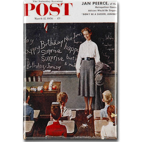 Norman Rockwell Saturday Evening Post cover March 17, 1956. Rockwell intended this painting to be a tribute to his own eighth-grade teacher who had encouraged him to draw. Gathering a local model and students, Rockwell used a real grammar school classroom in Stockbridge as his reference.