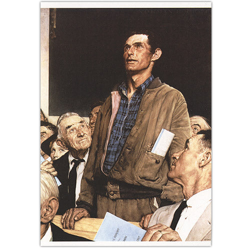 Finding new ideas for paintings never came easily but The Four Freedoms were a greater challenge. "It was so darned high-blown," Rockwell said, "Somehow I just couldn't get my mind around it." While mulling it over, Rockwell, by chance, attended a town meeting where one man rose among his neighbors and voiced an unpopular view. That night Rockwell awoke with the realization that he could paint the freedoms best from the perspective of his own hometown experiences using everyday, simple scenes such as his own town meeting.