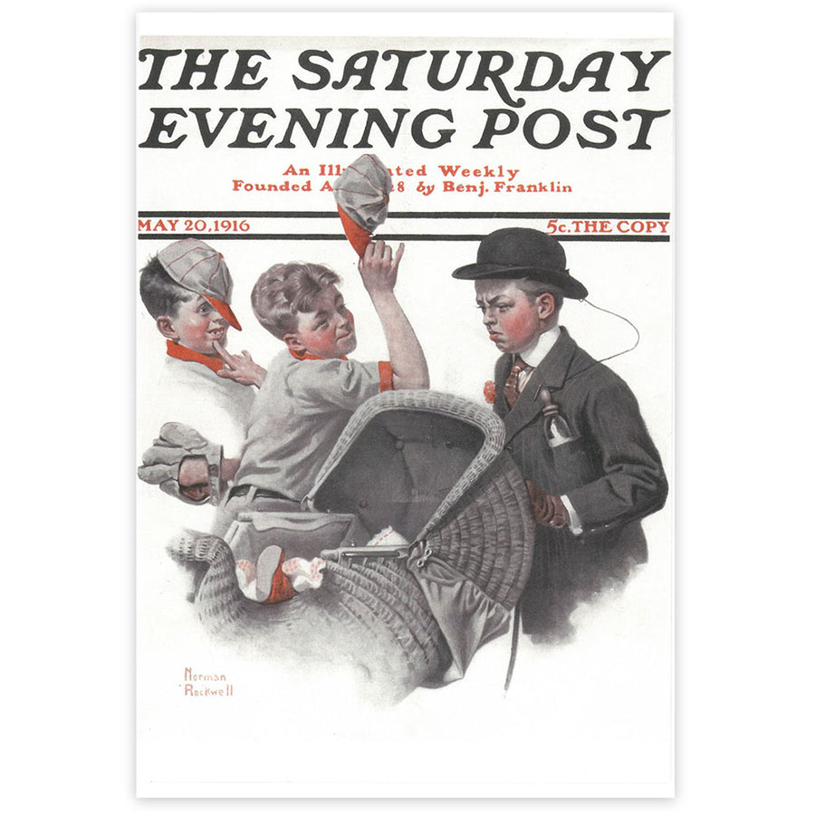 Norman Rockwell Boy with Baby Carriage, The Saturday Evening Post cover, May 20, 1916. Standard size postcard measures 4" inches by 6" printed on heavy weight card stock.