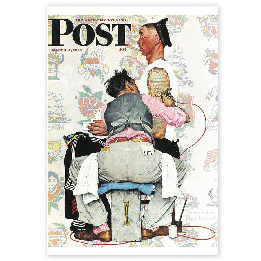 Rockwell's Tattoo Artist Saturday Evening Post cover celebrates the "permanence" of body art, painted some 60 years before the nation's current tattoo craze. The humorous illustration depicts a sailor who has fallen for several women in his day, and paid tribute to them (if temporarily) on his forearm. Continuing with the theme of the illustration, Rockwell also created a very clever background for the painting, consisting of popular tattoo designs. Created while living in Arlington, Vermont, Rockwell called on his friend and fellow illustrator Mead Schaeffer to pose as the tattoo artist.