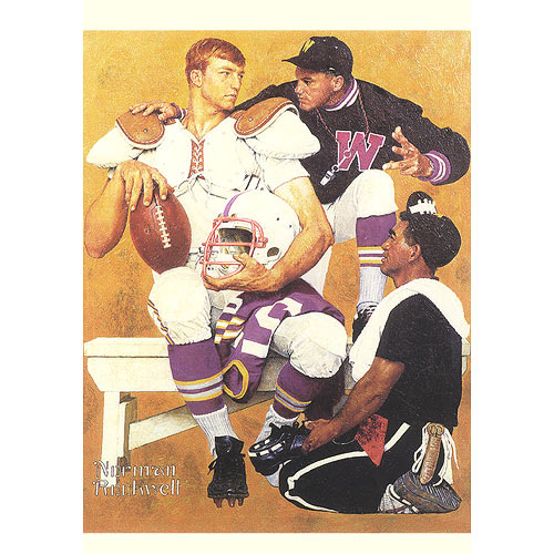 In 1966, Look sports editor Gerald Astor reported on the competition among colleges to recruit student athletes. The specter of recruiting talented high school athletes who might not meet or maintain academic standards emerged in the mid 1960s, and the temptation by colleges to lure talent through extravagant inducements was already rumored. To illustrate Astor's piece, Rockwell chose a football coach, trainer, and student from nearby Williams College to pose for his painting. He based the football player on Michelangelo's sculpture of Giuliano de'Medici, showing his model a photo of the sculpture to help him assume the pose.