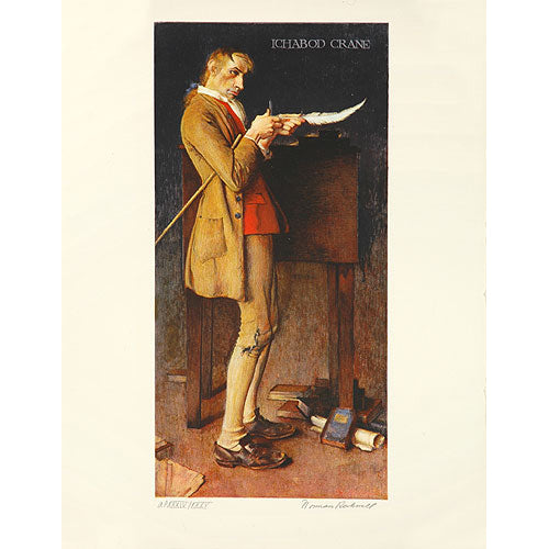 Originally created in 1937, Ichabod Crane was hand proofed and printed by Circle Gallery. The lithograph measures 26 by 20 inches, and the edition consists of 295 impressions. 200 were numbered and 60 artist proofs were signed in pencil by Norman Rockwell. An additional 35 prints were pencil signed and designated with roman numerals.