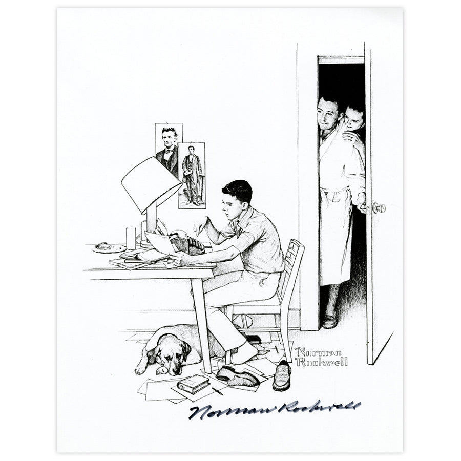 Midnight Oil was originally created for the American Family Life series for Mass Mutual Insurance Co. This autographed print reproduction measures 14" by 11" inches on heavy cardstock paper. Part of a unique selection of exclusive autographed copies donated to Norman Rockwell Museum Store, this item was not created through established limited edition printmakers like Atelier Ettinger Inc. or Circle Gallery. Although the print is a copy of a reproduction, the signature is original in permanent ink. However, the image quality is highly contrasted with fine line work appearing faint, and dominant darker tones.