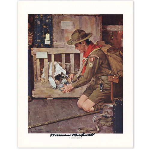 This limited edition offset print is an image rendered by Norman Rockwell entitled A Good Scout for the Boys Scouts of America. The image is a depiction of a scout helping a dog and was used in the 1935 Boy Scout Calendar. The print has rich vibrant colors with a white border in excellent condition and has not been conserved. One the outstanding features of this print is in Norman Rockwell's eye for detail that engages the viewer. The print measures 14 X 11 inches and is hand signed by Norman Rockwell at the bottom in permanent marker.