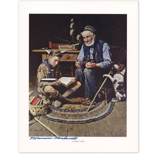 This limited edition offset print is an image rendered by Norman Rockwell entitled A Good Turn for the Boys Scouts of America. This image was used as the 1926 calendar illustration for the Boys Scouts of America. The print is in pristine condition with rich vibrant colors and a white border. The print has not been conserved. An outstanding feature of this print is in Norman Rockwell's eye for detail that engages the viewer. The print measures 14 X 11 inches and is hand signed by Norman Rockwell at the bottom in permanent marker.