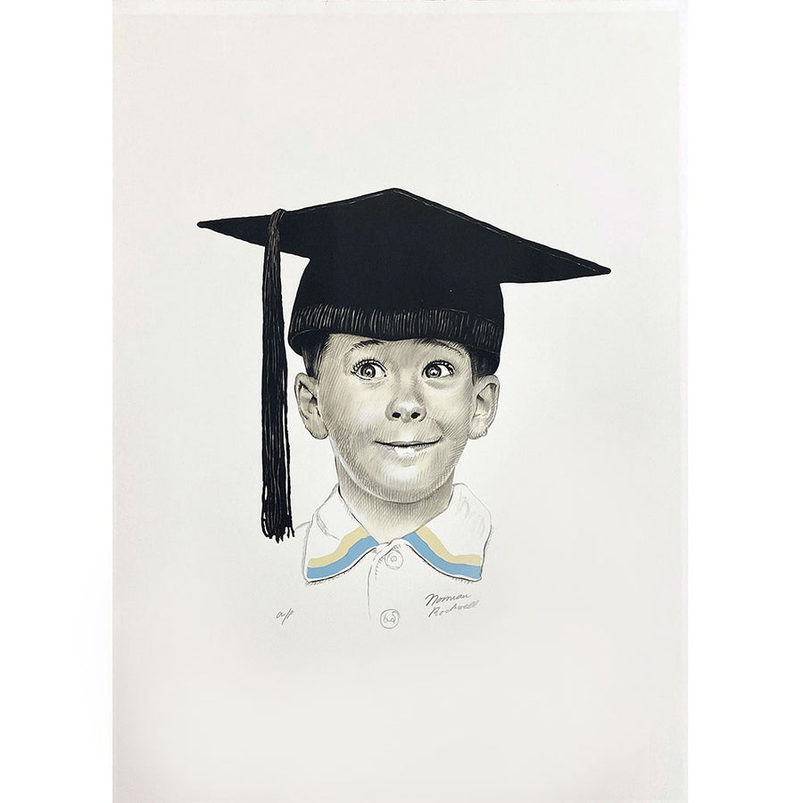 This print depicts a young boy with a graduation cap on. The print suggests that a family should start preparing for this child's graduation day early with Fidelity Bank. Rockwell's ability to move his viewer's emotions was prized not only by magazine art editors, but by advertisers as well. Like most Post cover artists, Rockwell painted advertisements for everything from Jell-O to insurance.
