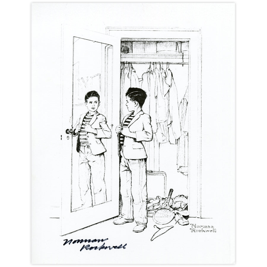 Boy at Mirror was originally created for the American Family Life series for Mass Mutual Insurance Co. This autographed print reproduction measures 14" by 11" inches on heavy cardstock paper. Part of a unique selection of exclusive autographed copies donated to Norman Rockwell Museum Store, this item was not created through established limited edition printmakers like Atelier Ettinger Inc. or Circle Gallery. Although the print is a copy of a reproduction, the signature is original in permanent ink. However, the image quality is highly contrasted with fine line work appearing faint, and dominant darker tones.