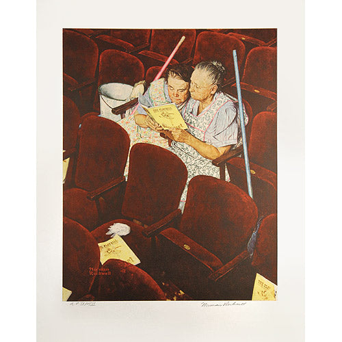 Charwomen in the Theater is a depiction of two cleaning ladies in a movie theater. The ladies are sitting back taking a break from their duties, relaxing and reading over a playbill. Typical details include wrinkles in their aprons, a well-worn mop and a scattering of debris. The ladies modeling for Rockwell were his neighbors and apprehensive about posing as cleaning ladies. However, Rockwell convinced them they were only acting. The print is in excellent condition very detailed with vivid color and contrast. Charwomen in the Theater was used on the cover of The Saturday Evening Post on April 6, 1946.