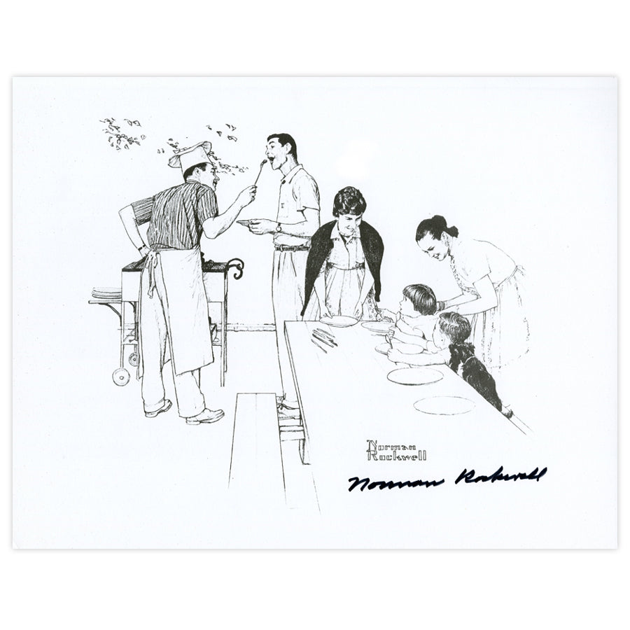 Cookout was originally created for the American Family Life series for Mass Mutual Insurance Co. This autographed print reproduction measures 14" by 11" inches on heavy cardstock paper. Part of a unique selection of exclusive autographed copies donated to Norman Rockwell Museum Store, this item was not created through established limited edition printmakers like Atelier Ettinger Inc. or Circle Gallery. Although the print is a copy of a reproduction, the signature is original in permanent ink. However, the image quality is highly contrasted with fine line work appearing faint, and dominant darker tones.