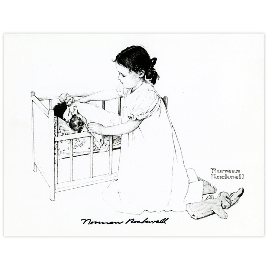 Doll Lulaby was originally created for the American Family Life series for Mass Mutual Insurance Co. This autographed print reproduction measures 14" by 11" inches on heavy cardstock paper. Part of a unique selection of exclusive autographed copies donated to Norman Rockwell Museum Store, this item was not created through established limited edition printmakers like Atelier Ettinger Inc. or Circle Gallery. Although the print is a copy of a reproduction, the signature is original in permanent ink. However, the image quality is highly contrasted with fine line work appearing faint, and dominant darker tones.