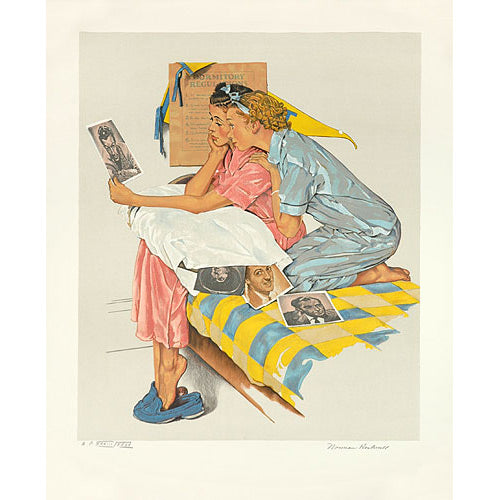 Rockwell's Dreamboats illustrates two young women gushing over their favorite movie stars before bed. The dormitory rules regulate bedtime hours; however, that does not stop the girls from day dreaming of someday meeting the handsome stars. Dreamboats depicts a common scene as images of movie stars appeared in magazines and newspapers, allowing individuals to escape into fantasy worlds by imagining what it would be like to lead a glamorous lifestyle.