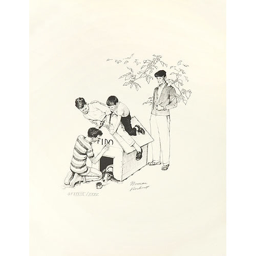 Fido's Dog House print was originally created for the American Family Life series for Mass Mutual Insurance Co. The lithograph, hand proofed and printed by Circle Gallery, measures 26 by 20 inches. The edition consists of 295 impressions, 60 of which were pencil signed by Norman Rockwell. 200 of the prints were numbered and 35 impressions were pencil signed and designated with Roman numerals.