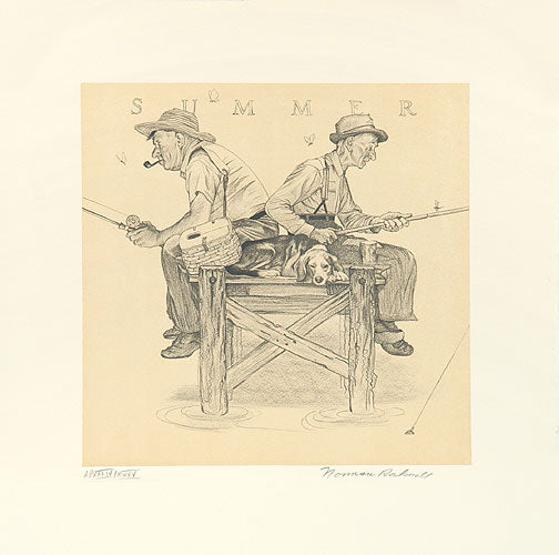 Brown and Bigelow commissioned Rockwell to produce numerous four season calendars. Two Old Men & Dog- Fishing Dock, used for the 1953 calendar, was a typical summer scene that strived to capture the essence of the season. It aimed “to convey something of feeling of the seasons by the poses.” The variety of poses used for the old men and dog allowed Rockwell to achieve specific moods. He captured the quiet and reflective nature of the seasons. –Norman Rockwell from Rockwell on Rockwell
