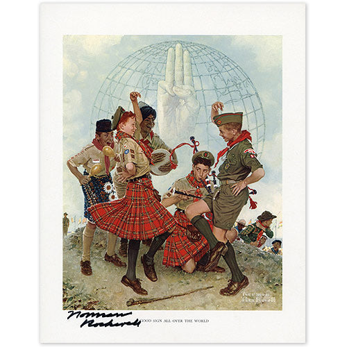 This limited edition offset print is an image rendered by Norman Rockwell entitled A Good Sign all Over the World for the Boys Scouts of America. The print was used for the Boy Scouts of America 1963 calendar illustration. The image is a depiction of international harmony in scouting. The print has rich vibrant colors with a white border in pristine condition and has not been conserved. An outstanding features of this print is in Norman Rockwell's eye for detail that engages the viewer. The print measures 14 X 11 inches and is hand signed by Norman Rockwell at the bottom in permanent marker.