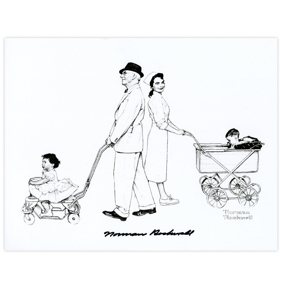 Grandfather Wheeling Baby was originally created for the American Family Life series for Mass Mutual Insurance Co. This autographed print reproduction measures 14" by 11" inches on heavy cardstock paper. Part of a unique selection of exclusive autographed copies donated to Norman Rockwell Museum Store, this item was not created through established limited edition printmakers like Atelier Ettinger Inc. or Circle Gallery. Although the print is a copy of a reproduction, the signature is original in permanent ink. However, the image quality is highly contrasted with fine line work appearing faint, and dominant darker tones.
