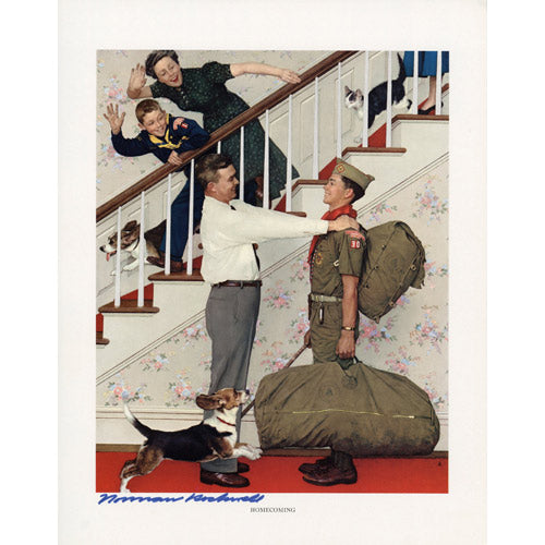 This limited edition offset print is an image rendered by Norman Rockwell entitled Homecoming for the Boys Scouts of America. The image is depiction a Scout returning home and being greeted by his family. This image was used for their calendar illustration in 1961. The print has rich vibrant colors with a white border in excellent condition and has not been conserved. An outstanding feature of this print is in Norman Rockwell's eye for detail that engages the viewer. The print measures 14 X 11 inches and is hand signed by Norman Rockwell at the bottom in permanent marker.