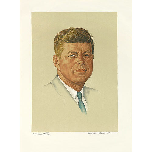 In October of 1976 Atelier Ettinger Inc. hand proofed and printed John Kennedy, an eleven-color lithograph. The edition, measuring 17 by 23 ¼ inches, consists of 320 impressions on papier d'Arches. 200 were numbered and 60 artist proofs were signed in pencil by Norman Rockwell. An additional 35 prints, pencil signed and designated with roman numerals, were reserved for the artist, and 25 deluxe edition prints were printed on Nacre (Japon) Paper.