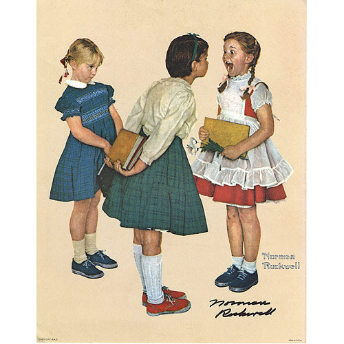 This limited edition offset print entitled Missing Tooth/Girl Missing Tooth/The Checkup measures 14 X 11 inches and was hand signed by Norman Rockwell in permanent marker at the bottom. The print is in excellent condition with vibrant color and clarity. The image is that of three young girls one having just returned from the dentist showing where her tooth had been. This image was used for The Saturday Evening Post cover on September 7, 1957.