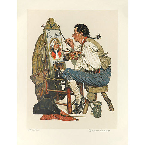 Originally created for the February 6, 1926 edition of The Saturday Evening Post, this 26.5 by 21 inch lithograph was hand proofed and printed by Atelier Ettinger. The edition consists of 320 prints, 200 were numbered and 60 artist proofs were signed in pencil by Norman Rockwell. An additional 35 prints were pencil signed and designated with Roman numerals, and 25 deluxe prints were printed on Nacre (Japon) paper. Pipe and Bowl was the first Saturday Evening Post cover to appear in full color. This cover depicts a colonial artist painting a sign for "Ye Pipe and Bowl Tavern." This cover was most likely Rockwell's way of relating to his own kindred spirit from 1785 - the colonial sign painter. The subject of the cover took in the patriotic obligations of the month, the identity of the magazine and its association with Ben Franklin and the Colonial period, the tradition of humor.