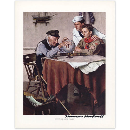 This limited edition offset print is an image rendered by Norman Rockwell entitled Scouts of Many Trails for the Boys Scouts of America. This print was used for their 1937 calendar illustration. The print is in pristine condition with rich vibrant colors and clarity with a white border. One of the outstanding features of this print is in Norman Rockwell's eye for detail that engages the viewer. The print measures 14 X 11 inches and is hand signed by Norman Rockwell at the bottom in permanent marker.
