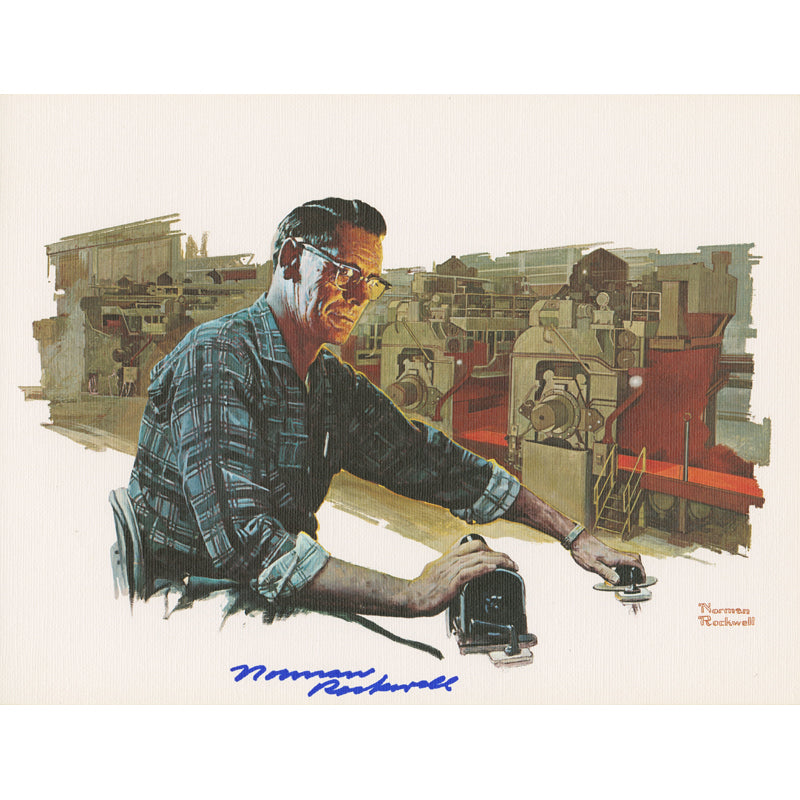 Then 72 years old, Rockwell worked with his third wife, Molly, over a four-day period in photographing the men who were subjects in this series of illustrations. He later completed the 23-by-30 paintings in his studio at the time, in Stockbridge, Massachusetts. However, Rockwell only painted the figures of the workers; the elaborate industrial backgrounds in sharp perspective were created by Cleveland illustrator Tony Dennison.