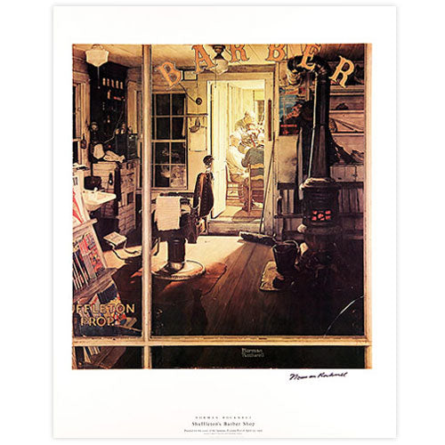This limited edition offset print entitled Shuffleton's Barbershop measures 28 X 26 inches and was hand signed by Norman Rockwell in the lower right corner in permanent marker. This depiction is very detailed and is in excellent condition.