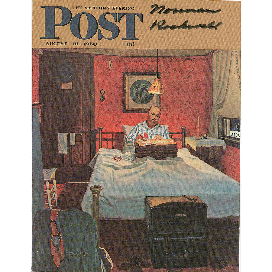 Solitaire was originally created for the August 19, 1950 cover of The Saturday Evening Post. This autographed print reproduction measures 7" by 10" inches on lightweight paper. Part of a unique selection of exclusive autographed copies donated to Norman Rockwell Museum Store, this item was not created through established limited edition printmakers like Atelier Ettinger Inc. or Circle Gallery. These images were printed on an offset press, with halftone screens and visible patterns; Rockwell's signature is original in permanent ink. For nearly 50 years, millions of Americans brought Norman Rockwell's art into their homes, enjoying the artist's Saturday Evening Post covers while seated in their favorite chairs, surrounded by their belongings in the company of their families. This intimate connection with Rockwell's art made his images a part of the fabric of American lives.