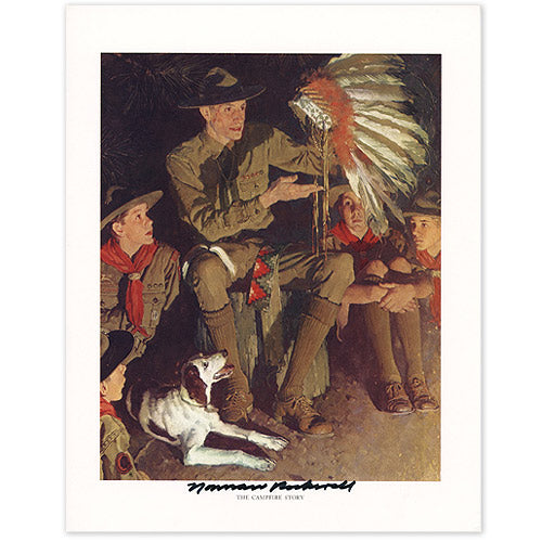 This limited edition offset print is an image rendered by Norman Rockwell entitled The Campfire Story for the Boys Scouts of America. The print was used for the Boy Scouts of America 1936 calendar illustration. The image is that of a scout leader telling stories around a campfire The print has rich vibrant colors with a white border in pristine condition and has not been conserved. An outstanding features of this print is in Norman Rockwell's eye for detail that engages the viewer. The print measures 14 X 11 inches and is hand signed by Norman Rockwell at the bottom in permanent maker.