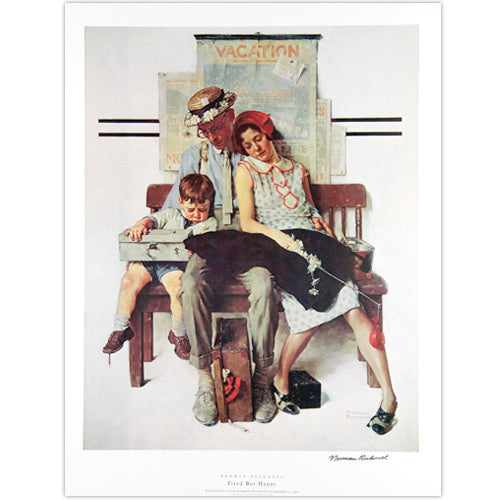 Clues carefully incorporated into this painting of a family returning from vacation assist us in unfolding the details of where the family went, what they did, and how they may have enjoyed it. Travel, Rockwell's only passion other than art, is the subject of many of his paintings. By the time of this painting, Rockwell had been to South America, made three trips to Europe, and just returned from an extended trip to California where he met and married his second wife, Mary Barstow. Soon after, troubled by problems with his work, Rockwell began experimenting with Jay Hambidge's theory of dynamic symmetry in which composition is determined by a system of diagonal lines that are proportional to each other and that create movement. In Home From Vacation (Tired But Happy), strong diagonals give a static subject feeling of movement and life. He employs another device-the classic triangle-for his arrangement of the three figures. Touches of red lead our eye around the canvas and up into the faded lettering of the travel poster, where the subject is announced, in case we have not guessed.