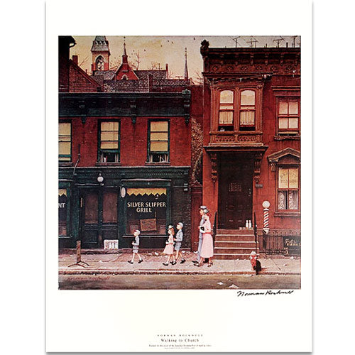 Just as Rockwell's people are often composites of features of different models, his architectural backgrounds are often combinations of different locales. In Walking to Church the distant church steeple belonged to Vermont's North Bennington Church. The storefront and brownstone came from Troy, New York. The patina of these older buildings provided the perfect contrast to set off the sparkle and newness of the young family's new Easter outfits. In the Post's caption for this picture, the editors claimed that Rockwell chose this smaller than usual canvas size to match Vermeer's painting, The Little Street.