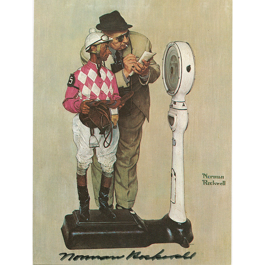 Weighing In (The Jockey) was originally created for the June 28, 1958 cover of The Saturday Evening Post. This autographed print reproduction measures 7" by 10" inches on lightweight paper. Part of a unique selection of exclusive autographed copies donated to Norman Rockwell Museum Store, this item was not created through established limited edition printmakers like Atelier Ettinger Inc. or Circle Gallery. These images were printed on an offset press, with halftone screens and visible patterns; Rockwell's signature is original in permanent ink. For nearly 50 years, millions of Americans brought Norman Rockwell's art into their homes, enjoying the artist's Saturday Evening Post covers while seated in their favorite chairs, surrounded by their belongings in the company of their families. This intimate connection with Rockwell's art made his images a part of the fabric of American lives.