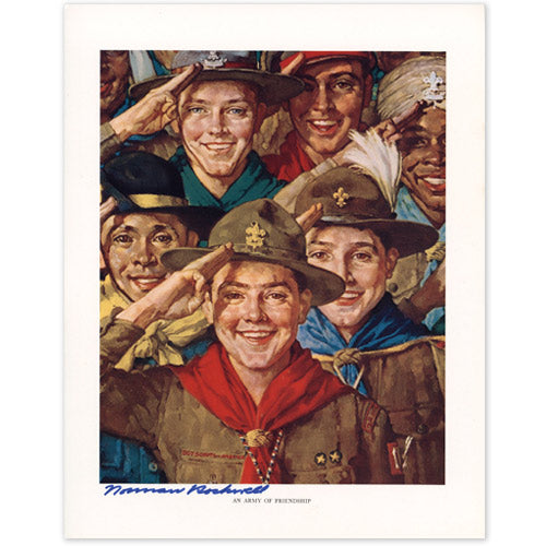 This limited edition offset print is an image rendered by Norman Rockwell entitled An Army of Friendship for the Boys Scouts of America. The image depicts scouting patriotism and was used for their 1933 calendar illustration. The print is in pristine condition with rich vibrant colors and a white border. It has not been conserved. An outstanding feature of this print is in Norman Rockwell's eye for detail that engages the viewer. The print measures 14 X 11 inches and is hand signed by Norman Rockwell at the bottom in permanent marker.