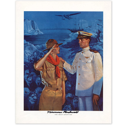 This limited edition offset print is an image rendered by Norman Rockwell entitled The Great Adventure for the Boys Scouts of America. The print is in pristine condition with beautiful vibrant colors and a white border. It has never been conserved. This depiction was used as the 1961 calendar illustration for the Boys Scouts of America. An outstanding feature of this print is in Norman Rockwell's eye for detail that engages the viewer. The print measures 14 X 11 inches and is hand signed by Norman Rockwell at the bottom in permanent marker.