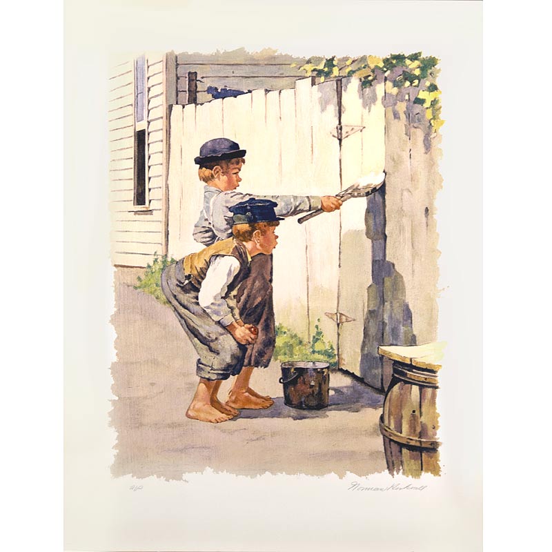 Originally created for Mark Twain's 1936 edition of Tom Sawyer Whitewashing the Fence was hand-proofed and printed by Circle Gallery in August 1971. The collotype measures 26 by 20 inches, and the edition consists of 295 impressions. 200 were numbered and 60 artist proofs were signed in pencil by Norman Rockwell. An additional 35 prints were pencil signed and designated with roman numerals.